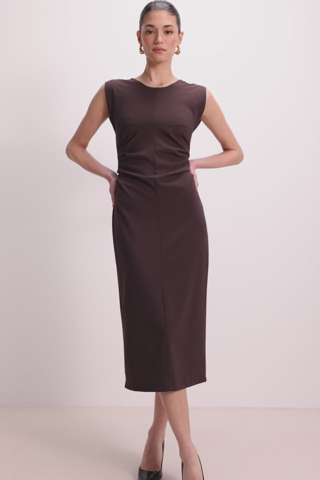 This midi dress features a sleeveless cut, waist ruching, and soft stretch fabric for a modern, flattering silhouette.